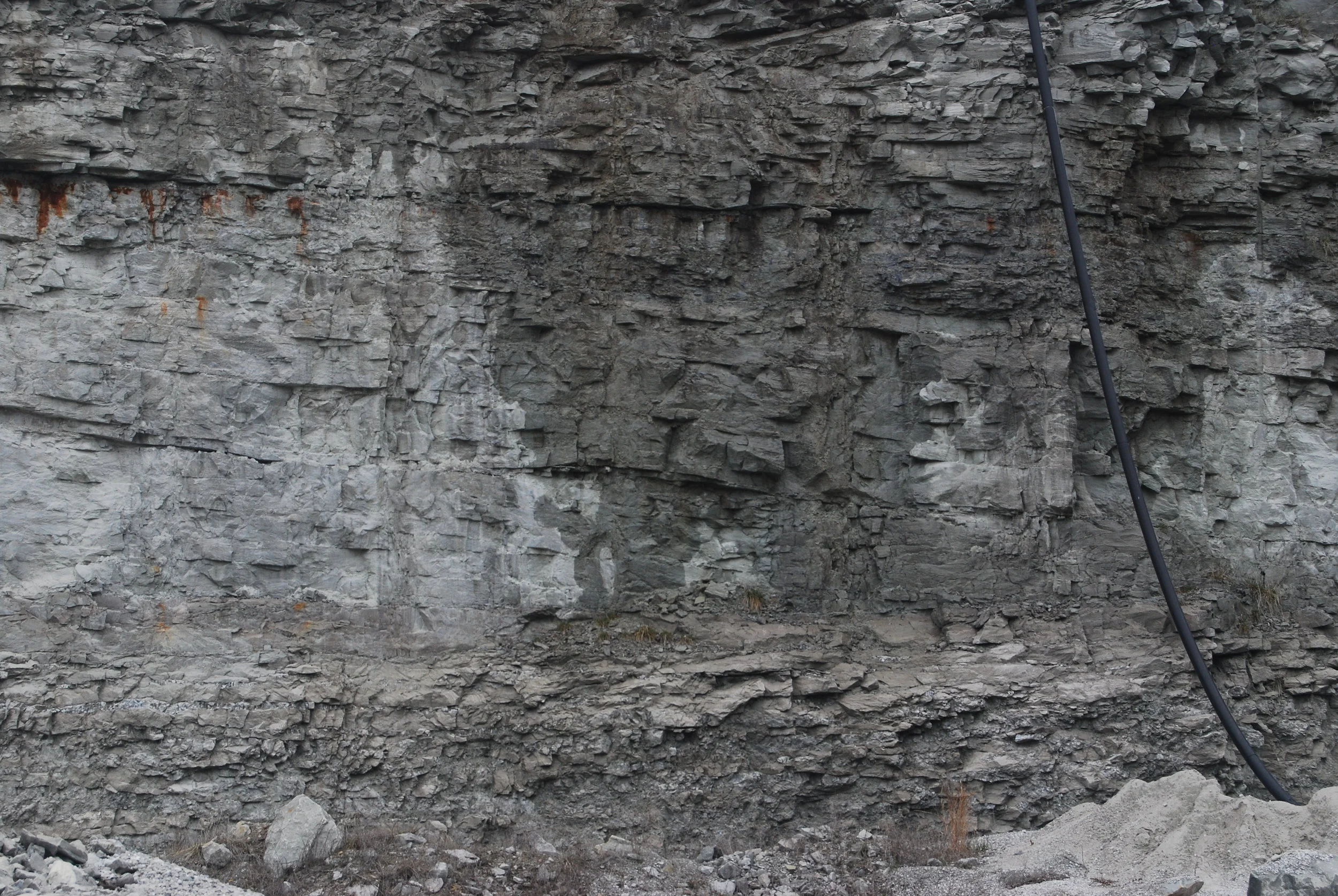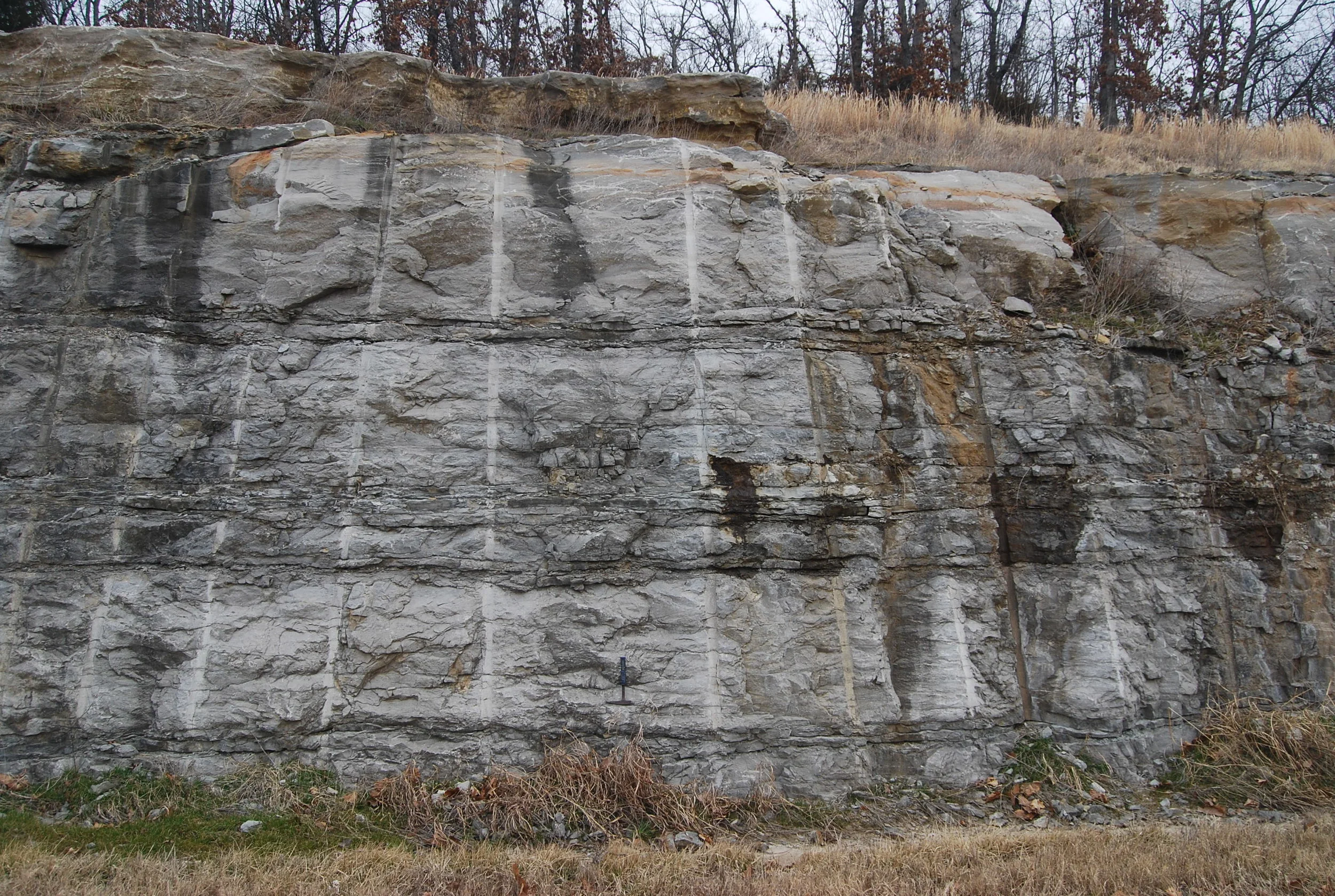 "Fairland Facies" of the Ritchey FormatioN (Boone Group; Meramecian; Visean) (Fairland Quarry, Ottawa County, Oklahoma). Top of the "Fairland Facies" coincides with the iron-staining in the upper left-hand corner of the photo. Short Creek Oolite is the light pink zone in the lower part of the photo.